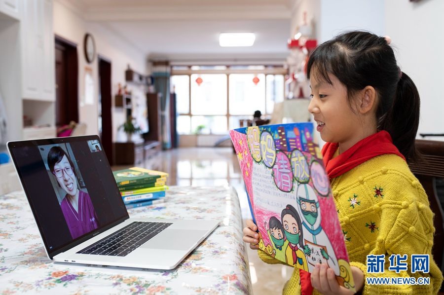 3月1日,呼和浩特市赛罕区敕勒川绿地小学学生杨艺冉在空中开学礼上与驰援武汉医疗队的妈妈进行视频通话。当日,内蒙古自治区呼和浩特市赛罕区敕勒川绿地小学举办“最好的偶像,就在当下”主题空中开学礼活动,通过线上升旗仪式、观看战疫感人视频、话说战疫英雄等环节,让学生了解战疫英雄偶像故事,感受战疫英雄偶像精神,在家里开启新学期。王正 摄