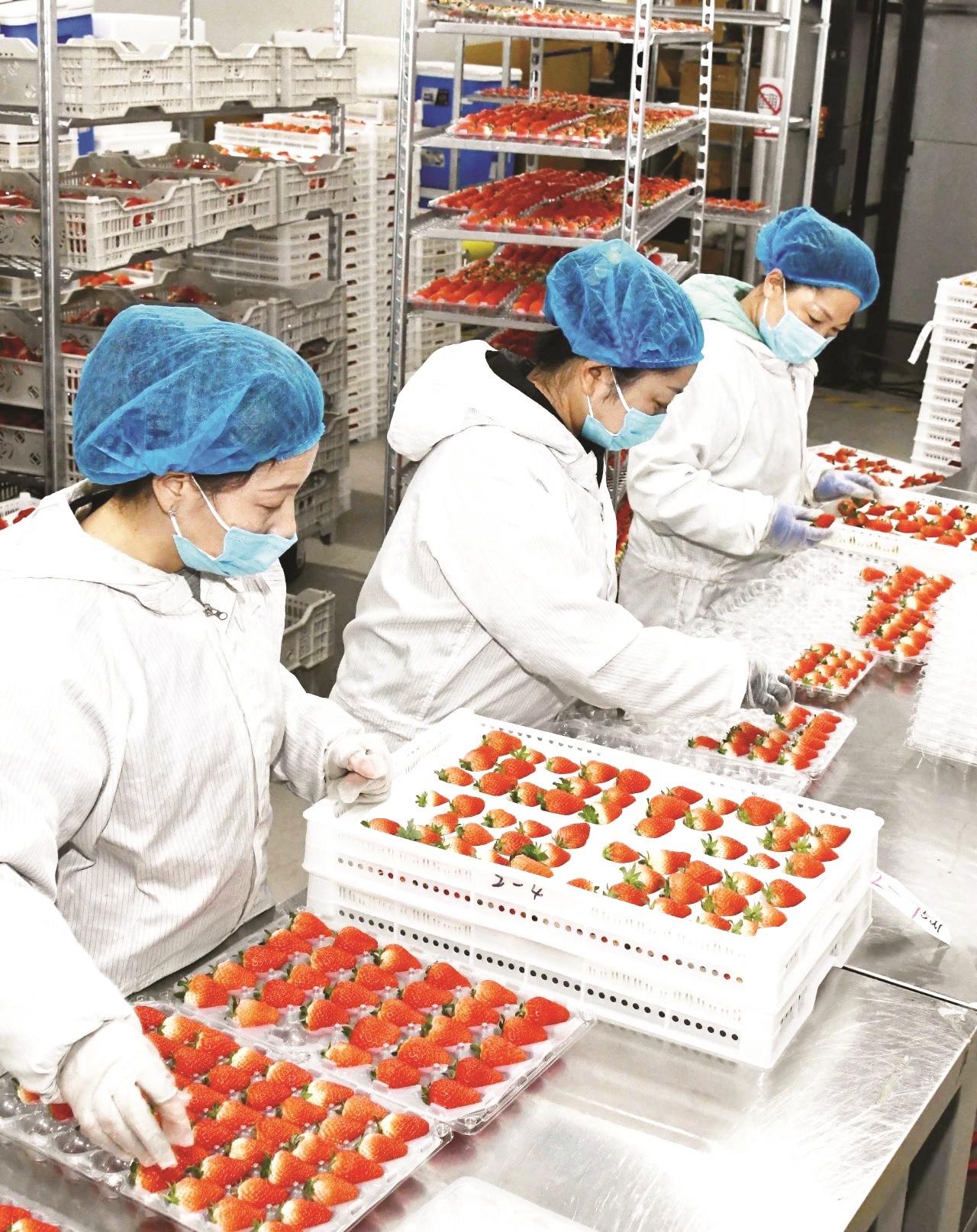 走进包装车间,只见工作人员正手法娴熟地包装着新鲜草莓。一颗颗新鲜草莓经过分拣、打包,将通过冷链运输,跨越山海,奔赴全球各地,与世界共享来自乌兰察布的“莓”好与甜蜜。