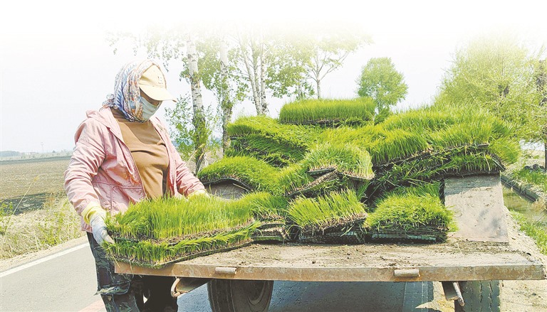 稻田中,稻农们分工明确,一株株嫩绿的水稻秧苗被整齐有序地插入泥土,每株间距精准,入土深度一致。稻农谭常亮感慨:“现在每天能种十七八亩地,机械化作业比以前人工插秧快多了。”
