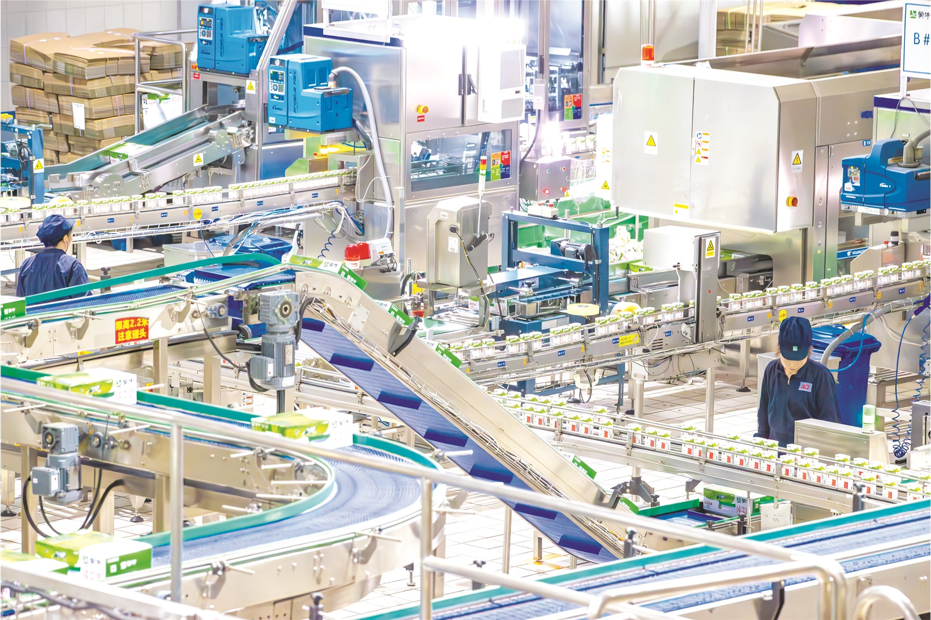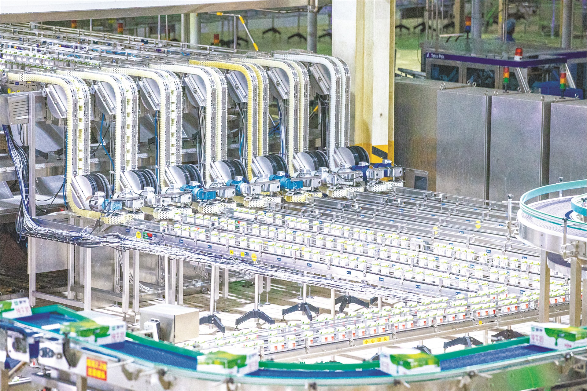 在乡村振兴的进程中,加工业的升级是产业提质增效的关键。产业园内的蒙牛数智化工厂,每小时灌装5.2吨牛奶的智能化设备自动运输车、机械臂连续作业,呈现出乳业现代化加工格局。