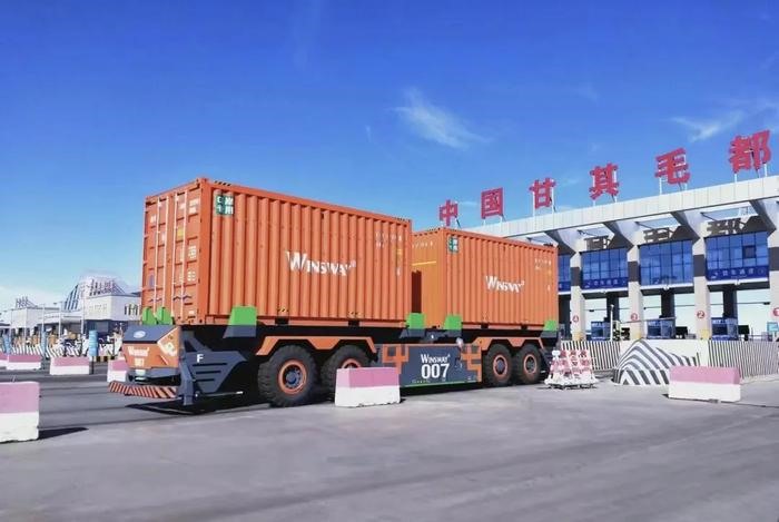 2022年7月,甘其毛都口岸首创AGV跨境运输货物模式,即AGV自动导引车辆通过埋设在地下的磁钉导引,沿指定线路自动往返监管场地,实现车辆自主过卡、装卸作业自主判断、出入境自动报关等功能。目前,共投入运营60辆AGV自动导引车,单车循环运输耗时约80分钟,单日运输效率为传统汽车5倍以上,日通行能力最高达500辆次。