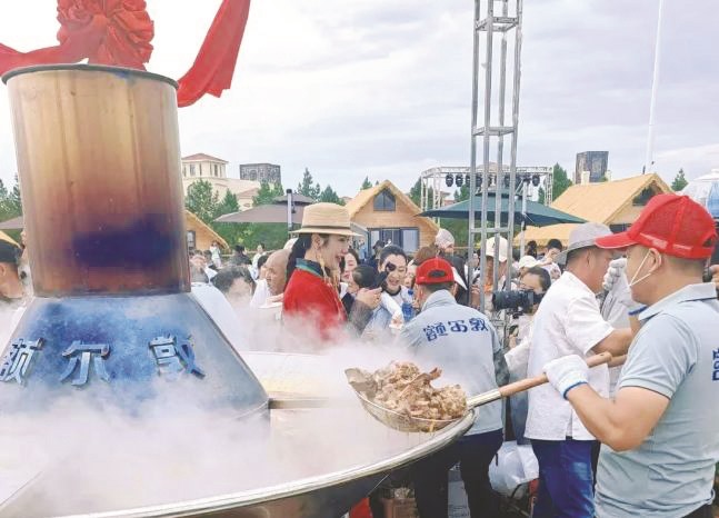 巨型铜锅正咕嘟作响,一锅翻腾着2吨鲜嫩的锡林郭勒羊肉片,红白相间的肉卷在沸水中轻轻一涮便蜷曲成花;一锅炖着2吨羊骨,骨髓随着咕嘟声微微颤动,骨香混着草香漫过整个营地;还有一锅盛满2吨羊杂,鲜醇气息勾得人频频驻足。