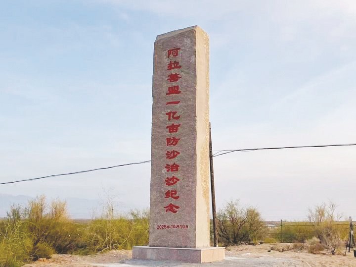 金秋时节,在阿拉善左旗沙漠与公路的交界处,一座崭新的纪念碑在阳光下静静矗立,碑文记录着一项惊人成就:全盟累计防沙治沙一亿亩。