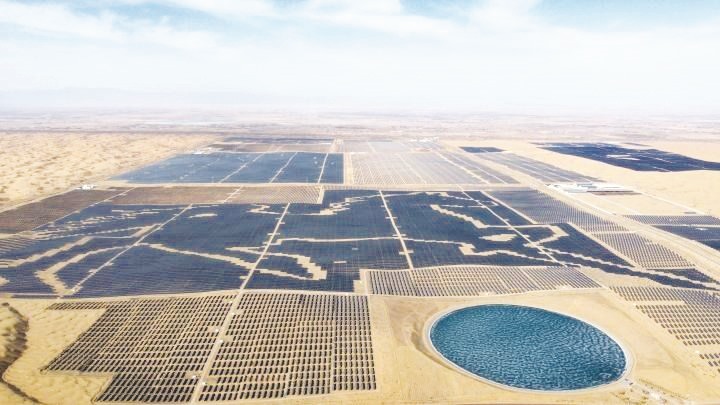 不止在库布其沙漠,在腾格里沙漠、乌兰布和沙漠等,大片光伏板正在沙漠中不断创下人类工程奇迹。