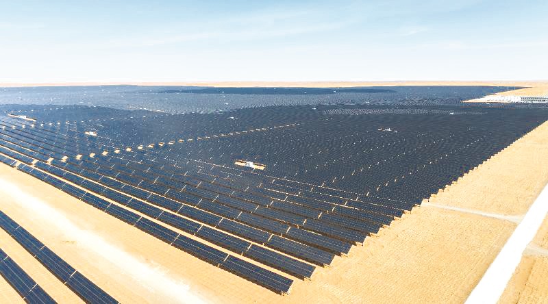 沙漠深处,一块块蓝色光伏板如波浪般向天际延伸,它们静静地吸收着炙热的阳光,将不毛之地变成巨大的“绿色电站”。