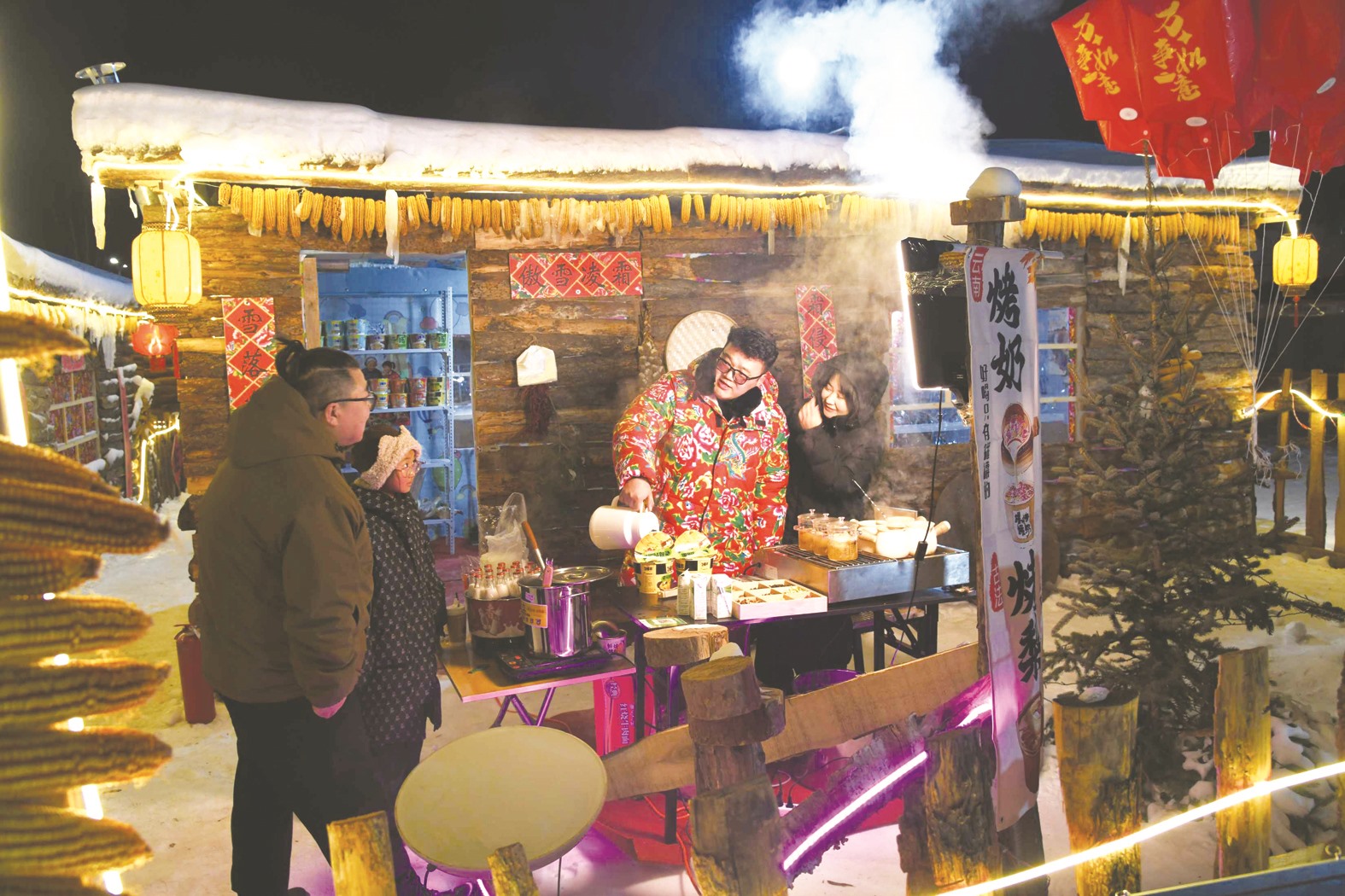 踏入“乌兰雪乡”民俗体验区看到,45座复刻北方传统风貌的院落集群映入眼帘,木栅栏上垂挂的红灯笼与蓬松雪层相映成趣,屋檐下悬垂的雪舌、雪帘勾勒出童话般的轮廓。每个院落都藏着专属打卡场景,游客穿梭其间,拍照打卡,其乐融融,他们的欢声笑语,为这个“雪乡”增添了浓浓的烟火气。