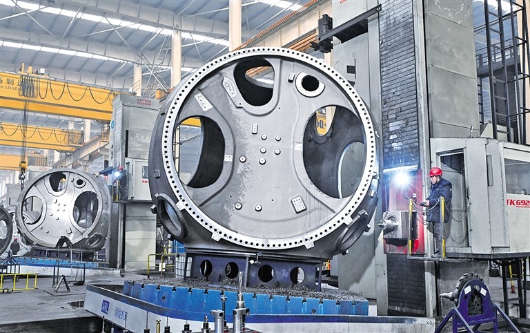 1月15日,在蒙东(通辽)高端重型基础装备制造产业基地,工作人员正在加工风力发电机零部件(孟和朝鲁 摄)