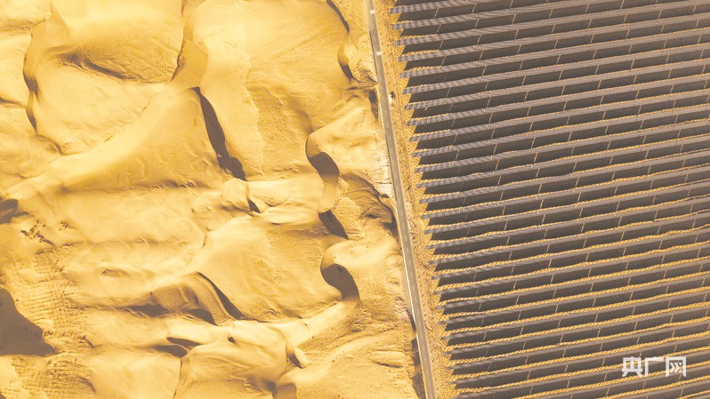 而在距离库布其沙漠不远处的达拉特旗昭君镇,另一种“绿色”正在加速生长。成片光伏板铺展在沙海之上,形成壮观的蓝色矩阵。这里是全国最大的沙漠集中式光伏发电基地之一,19.6万余块光伏板组成的“骏马”图案,在空中清晰可见。