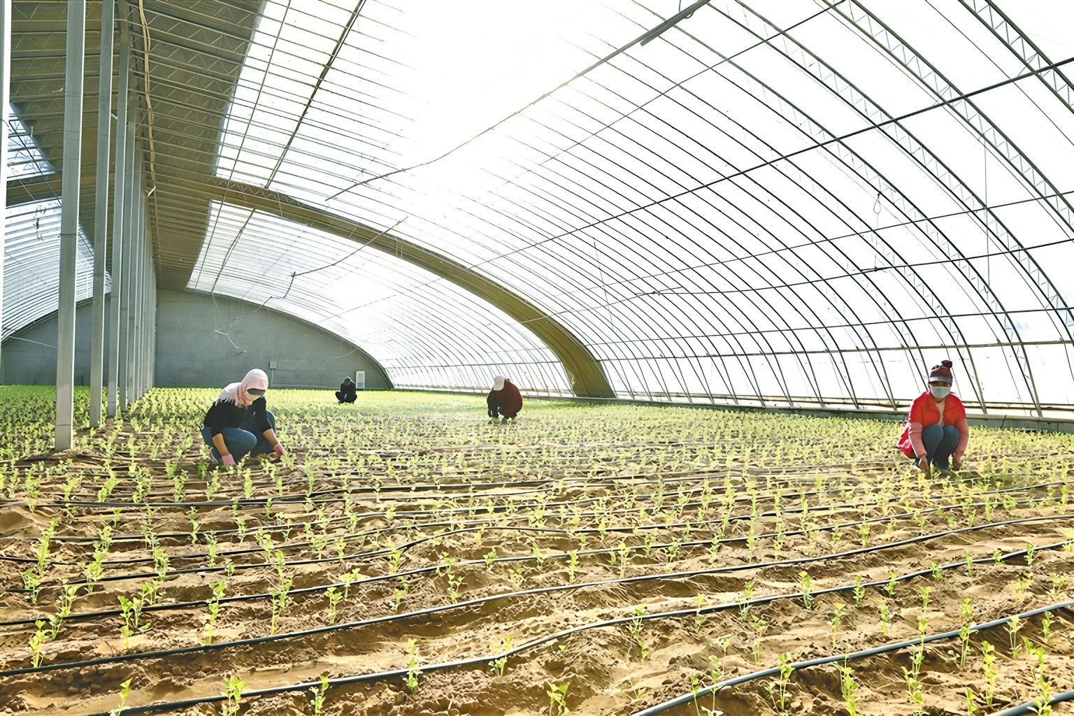 3月22日,在鄂尔多斯市鄂托克前旗一排智能温室内,育苗盘整齐划一,破土而出的种苗长势喜人。工人们正穿梭于苗床之间,熟练地进行间苗、补苗和浇水等工作。