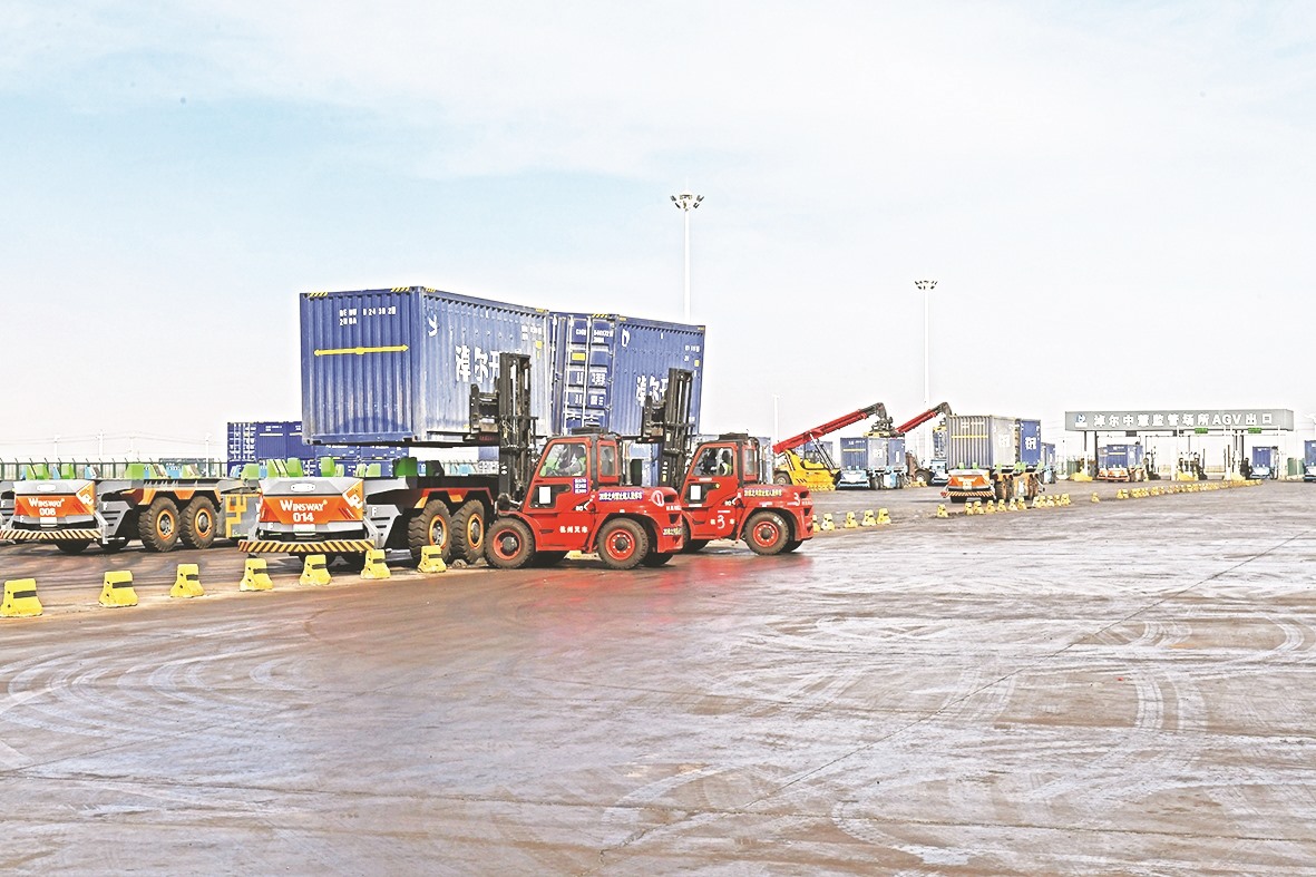 近日,在甘其毛都口岸淖尔中慧海关监管场所作业现场,一辆辆AGV无人驾驶跨境运输车有序穿梭。依托智能通关系统,车辆30秒就可“无感入境”,经过H986大型机检设备非侵入式查验后,全程实现闭环管理、高效流转。“每辆AGV装载两个标准集装箱,全程油转电驱动。单日运输量达7—8趟,不但运输效率比传统车辆高,而且实现了零接触、低能耗、高安全运输。”内蒙古淖尔中慧物流有限公司副总经理王博介绍。